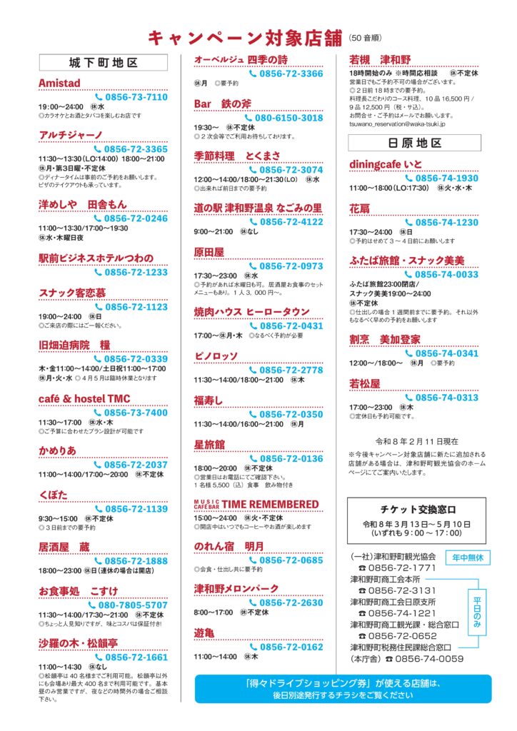 春の歓送迎会飲食キャンペーンが始まります!このキャンペーンは、対象店舗にて4名様以上でお一人様3000円以上のご宴会・仕出し・テイクアウトを利用された方に、津和野町内の対象店舗にて使用できる『得々ドライブショッピング券』をプレゼント致します!