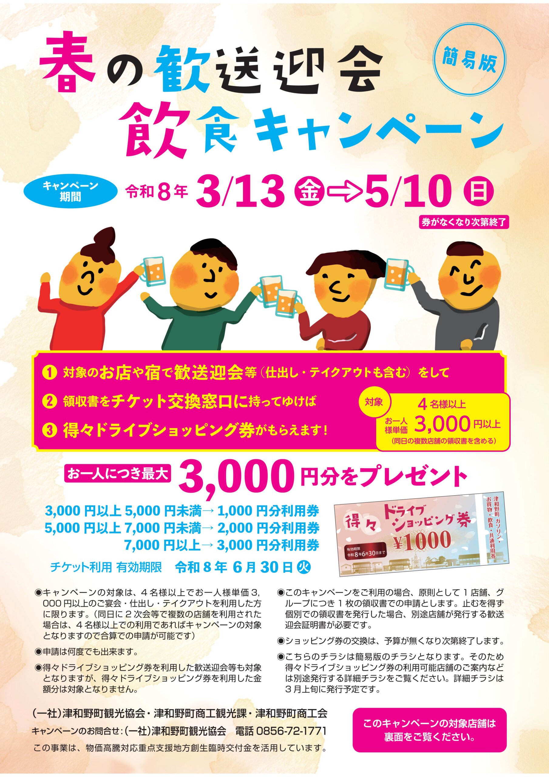 春の歓送迎会飲食キャンペーンが始まります!このキャンペーンは、対象店舗にて4名様以上でお一人様3000円以上のご宴会・仕出し・テイクアウトを利用された方に、津和野町内の対象店舗にて使用できる『得々ドライブショッピング券』をプレゼント致します!