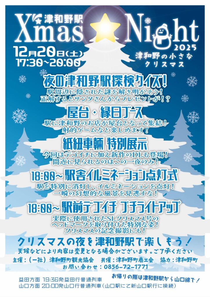 この日から始まる津和野駅イルミネーションの点灯式も実施!毎年恒例の駅探検クイズや屋台縁日ブースもあります。ぜひ山口線でお越しくださいませ!