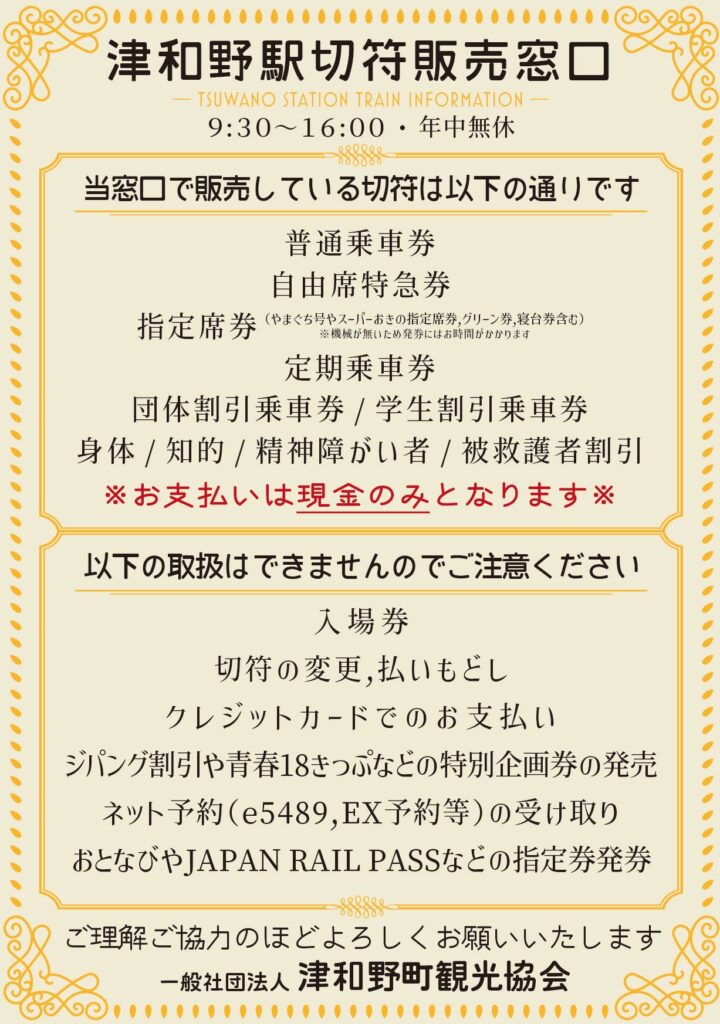 | 備考 | 津和野駅は無人駅です。みどりの窓口や券売機はありません。 簡易委託駅のため切符の販売のみを実施し、現金払いのみとなります。 また販売できる切符に制限がございます。きっぷの変更、払い戻しの対応はできません。 クレジットカードでのお支払いはできません。 ネット予約などで購入した切符の発券もできません。 ![]() |