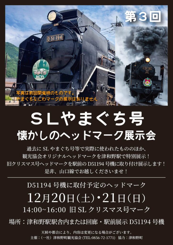 津和野町観光協会では駅前展示のD51194号機を活用し、12月20日(土),21日(日)に「第3回 SLやまぐち号 懐かしのヘッドマーク展示会」を開催いたします!