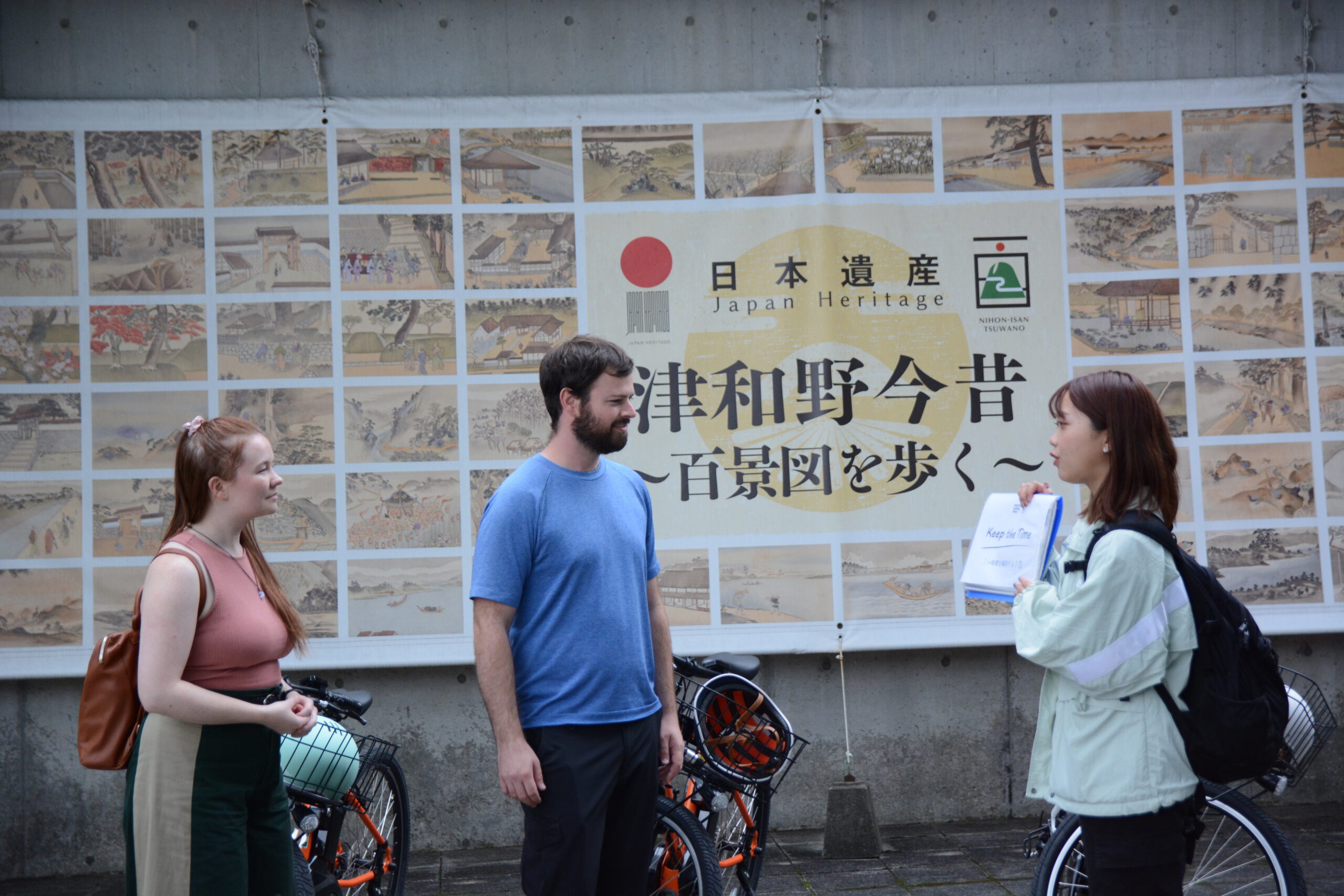 A tour guide will be waiting with bicycles lined up in front of the wall of paintings from Tsuwano’s Japan Heritage, “Hyakkeizu : One Hundred Sceneries of Tsuwano” from the Edo Period.